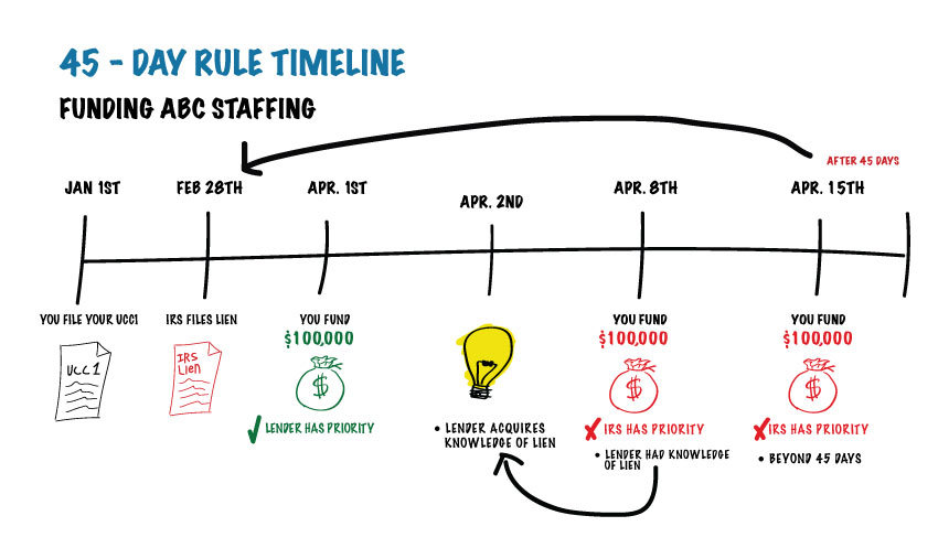 In this scenario, you, the lender, have previously filed your UCC1 and are currently funding ABC Staffing. On February 28, the IRS files a federal tax lien, but you have no knowledge of it. You go ahead and fund $100,000 on April 1. You then acquire knowledge of the lien on April 2. Despite knowledge of the federal tax lien, you fund another $100,000 on April 8, and yet another $100,000 on April 15 (which marks the 46th day since the lien was filed).